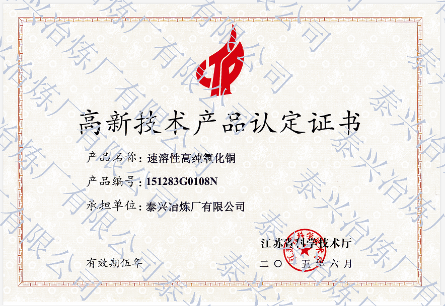 泰興冶煉廠有限公司(原泰興冶煉廠),始建于20世紀70年代初,現位于江蘇省泰興經濟開發區。歷經40年的創新驅動、穩健發展,已成長為一家專業生產堿式碳酸銅、高純電鍍氧化銅、氧化亞銅、氧化銅、無水硫酸銅、海綿銅粉及副產品聚氯化鋁(凈水劑)等系列無機鹽產品及處置不含氨的氯化銅蝕刻液(HW22)15000噸/年的“國家高新技術企業”和地方性骨干企業。公司總占地面積3.7萬平方米,建筑面積4萬平方米,注冊資本2088萬元,固定資產1.2億元,年產值約7億元。